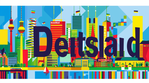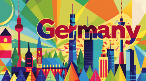 A pop art poster of the city skyline and the nature with landscape, with bold colors and geometric shapes, featuring skyscrapers in bright primary hues like reds, yellows, blues, and greens. The word "Germany" is written across it in large letters, with an illustration of iconic landmarks of Germany. This artwork would capture attention with its vibrant color scheme and modern design, in the style of John Holcroft. --ar 16:9 --s 3 --v 6.0