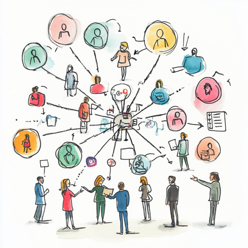 A social or work scenario, with the person interacting with other individuals in a balanced and collaborative way, to symbolize how emotional intelligence impacts personal and professional relationships. white background