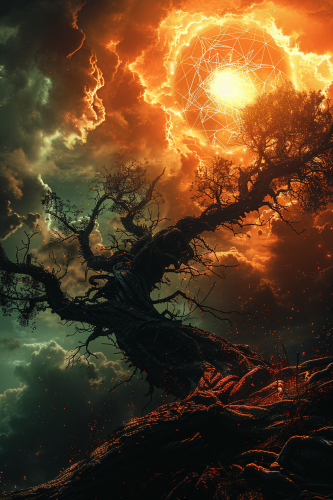 an abstract science-fiction novel cover featuring artificial intelligence. Imagine a vivid recreation of the themes present in Francisco Goya's painting Saturn Devouring His Son. Imagine a gnarled live-oak tree whose trunk looks as if it would devour the reader and its branches resemble a neural network and a grisly sun intent on destroying humanity. --ar 2:3 --no faces, letters, words --s 750