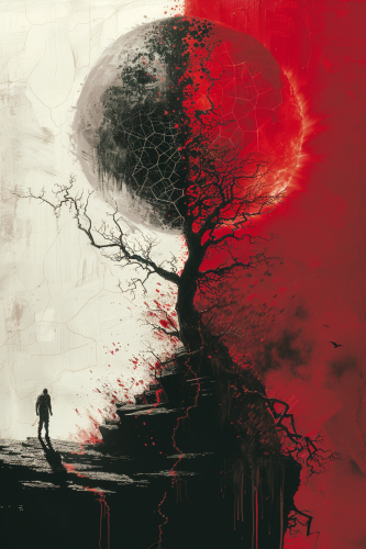 an abstract science-fiction novel cover featuring artificial intelligence. Imagine a vivid recreation of the themes present in Francisco Goya's painting Saturn Devouring His Son. Imagine a gnarled live-oak tree whose trunk looks as if it would devour the reader and its branches resemble a neural network and a grisly sun intent on destroying humanity. Whites, reds, and blacks as the potential primary colors. --ar 2:3 --no faces, letters, words --chaos 100 --s 750