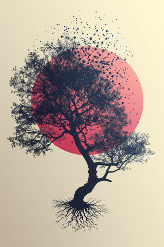an abstract science-fiction novel cover featuring artificial intelligence. Imagine a vivid recreation of the themes present in Francisco Goya's painting Saturn Devouring His Son. Imagine a gnarled live-oak tree whose trunk looks as if it would devour the reader and its branches resemble a neural network and a grisly sun intent on destroying humanity. Flat design, using whites, reds, and blacks as the potential primary colors.--ar 2:3 --no faces, letters, words --s 750