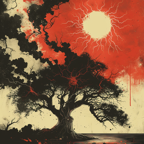 an abstract science-fiction book cover. Imagine a vivid recreation of the themes present in Francisco Goya's painting Saturn Devouring His Son. Imagine a gnarled live-oak tree whose trunk looks as if it would devour the reader and its branches resemble a neural network reminiscent of artificial intelligence. Imagine a grisly sun intent on destroying humanity. Whites, reds, and blacks as the potential primary colors. --ar 2:3 --no faces, letters, words --s 750