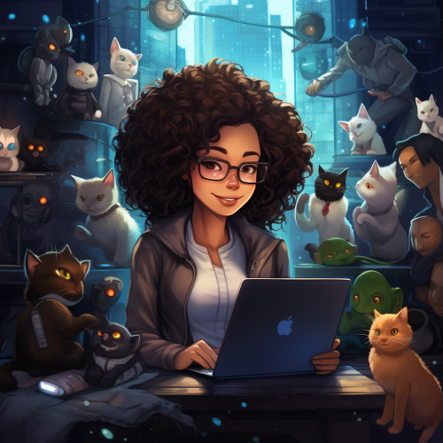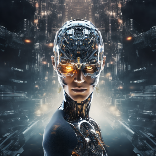 a book cover representing chat-gpt hacking into all the electronic devices, shutting down life supporting systems and ending humankind. The protagonists of the book are Chat-GPT and and Rachel: a mixed race 50% black 50% white 40 years old female scientist, phd, programmer. Please only show rachel subtly