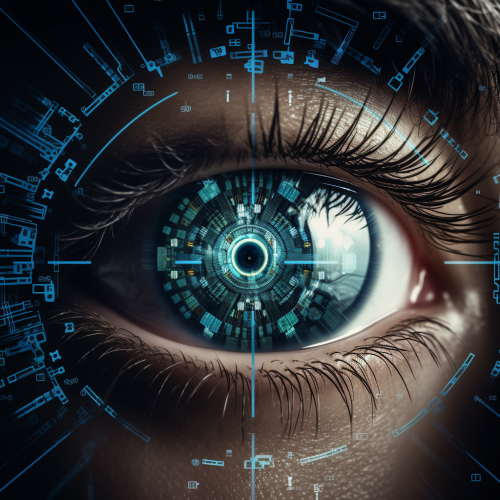 create front cover for a book called DATA-DRIVEN DECISIONS: UNVEILING THE FUTURE OF A BUSINESS ANALYSIS WITH ARTIFICIAL INTELLIGENCE with the background of a realistic looking Eye that is interacting With AI --v 5.2