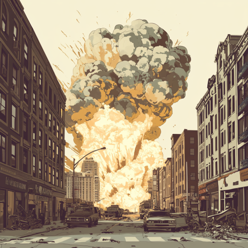 create a realistic illustration post-acalyptic picture of a nuclear explosion in an American city, the upper field turns into white. Slightly vector stylization. --ar 1:1