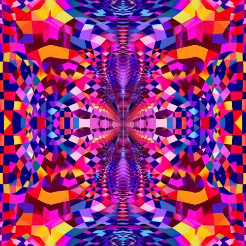 a pattern extremely bright end sharp multi-colored fluo with red, purple, blue, pink and yellow checkered, highly distorted, geometric sharp checkered pattern --v 6.0