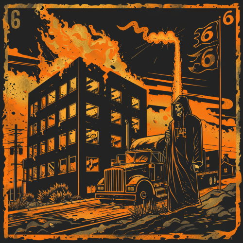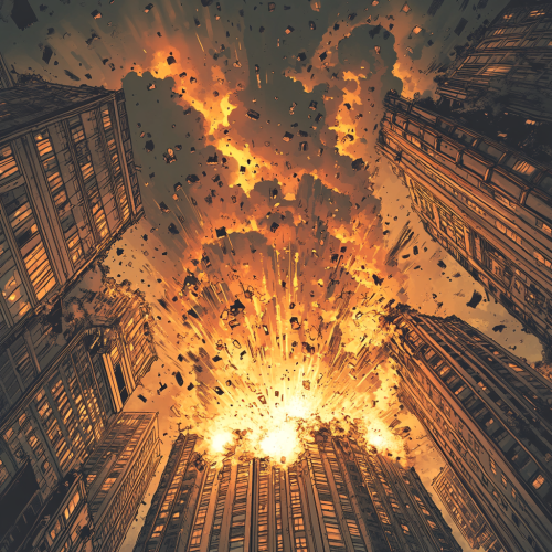 view from below into a city scape, burning building in the foreground with an explosion at the bottom of the building with bricks flying out, illustration