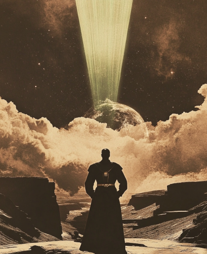 a king standing in front of a galactic explosion, detailed, grandiose space opera style, green and gold highlights, --ar 9:11 --sref 642333891 --c 5 --v 6.1