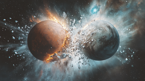 Two planets crash into eachother, pluto and neptune have collided and are in the process of disentegrating into space dust and ice cyststals which glint off the light from the far away sun, photorealistic --ar 16:9