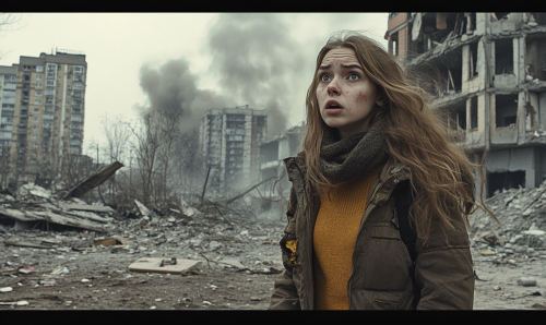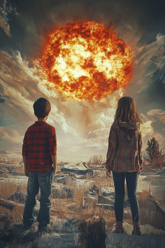 realistic colorful Illustration, photorealistic two teenage boys 14 years old and one girl 13 years old in post-acalyptic picture of a nuclear explosion, --ar 2:3
