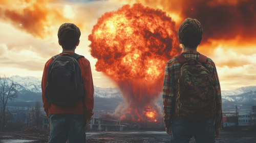realistic colorful Illustration, photorealistic two teenage boys 13 years old with a tourist backpack in post-acalyptic picture of a nuclear explosion, --ar 16:9