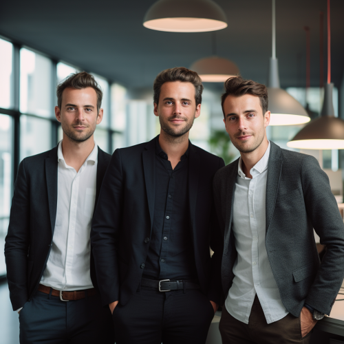 Benjamin Mayr, Philipp Heltewig, Sascha Poggemann standing closely together in a modern office