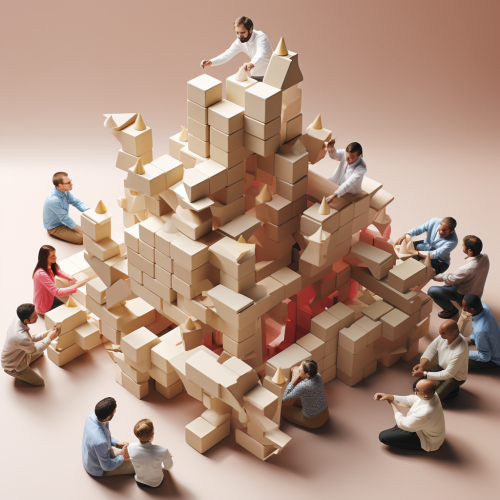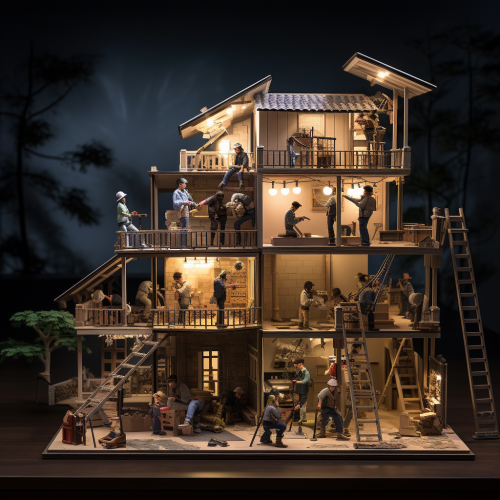 During the construction of a beautiful house, halfway through the project, imagine the scene where an architect, a plumber, an electrician, a carpenter, a painter, and the house builders are all diligently working together to bring their unique skills and expertise to create a harmonious and exquisite home. Describe this collaborative moment, capturing the essence of their roles and how their contributions blend to shape the dream house. Explore the intricate details of their work and the sense of accomplishment as they progress toward completing the house