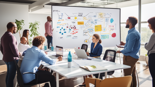 a group of diverse people in frount of a whiteboard ideating. Design Thinking. Photo realistic --ar 16:9