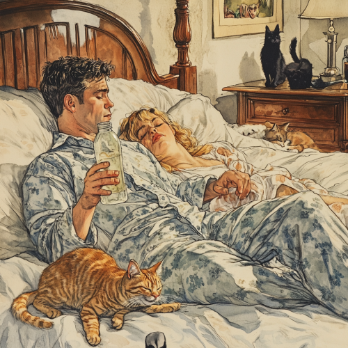An adult man dressed in pajamas is holding a plastic bottle without a lid in his hand, sitting in bed, next to him lies a young woman sleeping, you can only see her blond hair scattered on the pillow, she is covered up to her neck, on the bed are sleeping 3 cats with their tails standing straight and upright, a cat is standing next to the bed Added with upright tail raised, bedroom background, comic