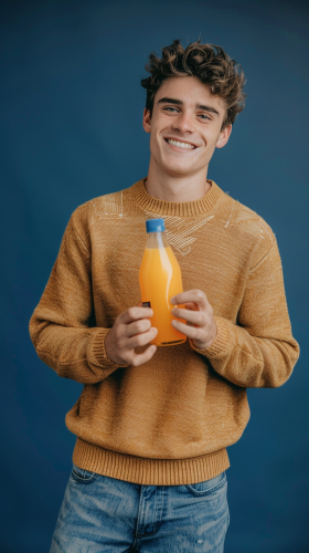 from the waist up of a young man in a light brown smart jumper and some jeans smiling holding a bottle of orange juice in her hands on a navy blue gradient background --ar 9:16 --v 6.0