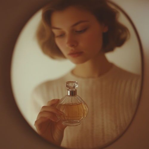 The image shows a woman reflected in a mirror. She holds a glass bottle of perfume in her right hand, which is partially hidden from view. The woman is wearing a light-colored top with a V-neck. She is looking down at the bottle of perfume, which is in the center of the image. The mirror is slightly rounded, and the background is a neutral light color. The overall tone of the image is soft and sophisticated, with the focus on the woman's reflection.