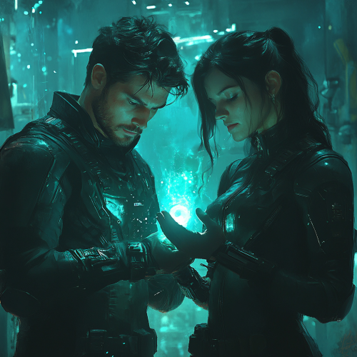 Male and female agents holding a glowing, magical pill in their hands, in a futuristic, cinematic style reminiscent of superhero movies like The Avengers. The scene is filled with vibrant, otherworldly lighting, with the pill emitting a mysterious, powerful glow. The agents wear sleek tactical outfits, standing in a dramatic, sci-fi setting with high-tech details and dynamic, epic atmosphere. High resolution, 9:16 aspect ratio --s 250