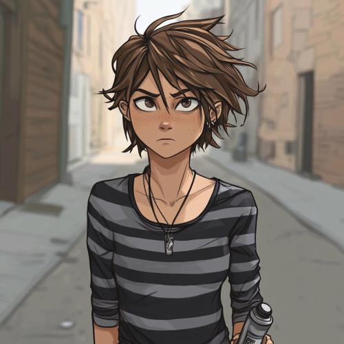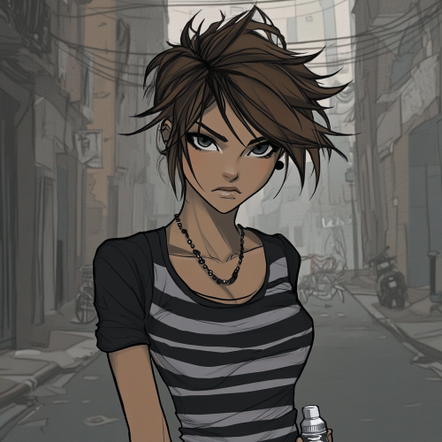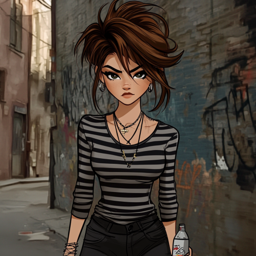 female profile picture, empty dull streets background, unfaced and uncaring expression, unamused, looking to the side, front view, medium length brown spiky messy hair, striped black and grey grunge shirt, necklace, grunge plain jeans, bottle in hand, cartoony style