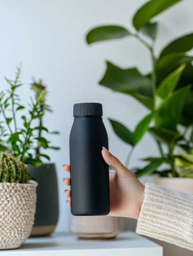 zoomed in to woman's arm and hand holding a black reusable water bottle, the background is clean white with a few plants, books, and textiles --ar 3:4