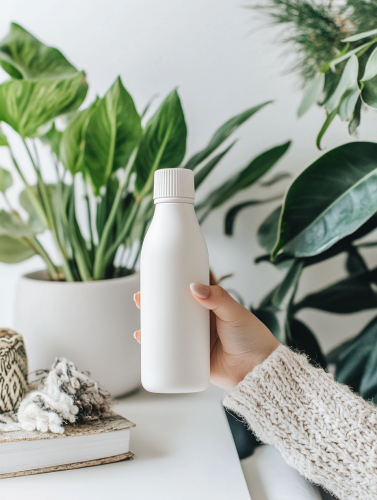 zoomed in to woman's arm and hand holding a white reusable water bottle, the background is clean white with a few plants, books, and textiles --ar 4:3