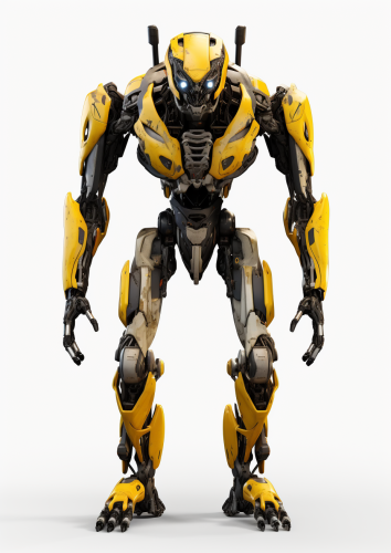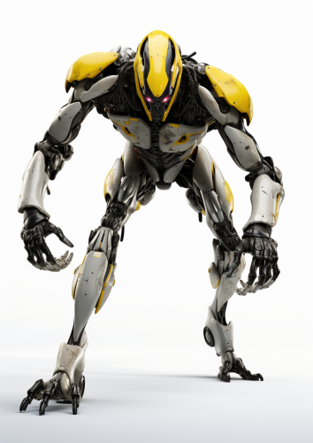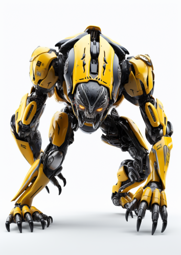 dynamic pose of an ape-like robot in the style of Boston dynamics, yellow and black with silver accents, scary, powerful, no head, large claws, oversized torso, in the style of Boston Dynamics, dynamic pose, photorealistic, on a white backdrop, octane render --ar 5:7