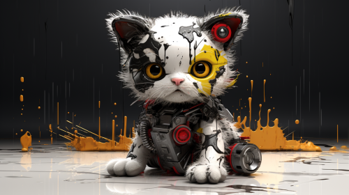 a cute little robot kitten in the style of boston dynamics, white and black with thick yellow accents, covered with splashes of red sauce, photorealistic, on a white backdrop, octane render --ar 16:9