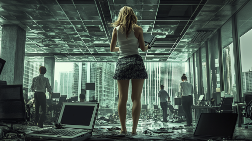 a woman destroys her laptop, while standing in an interminable cue of exhausted co workers in a modern coridor, grey day , 24 mm, realism image, cinematic style , hyper-realistic, highly detailed, daytime scene, atmospheric lighting, rich in detail, photography, high quality, --ar 16:9 --v 6.1