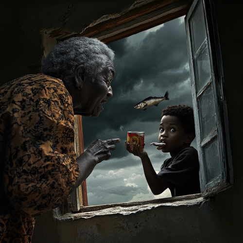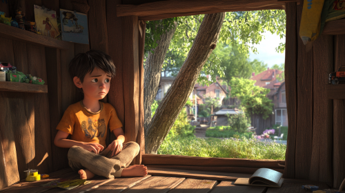 A young boy, Noah, sitting in a rustic treehouse made of wooden planks, looking out the window with a sad expression. The treehouse is surrounded by a lush green backyard, and in the distance, you can see houses and gardens. It's a sunny day, but Noah's disappointment is clear on his face. The interior of the treehouse has simple wooden furniture and scattered toys, with an open book lying on the floor. 3D render style. --ar 16:9