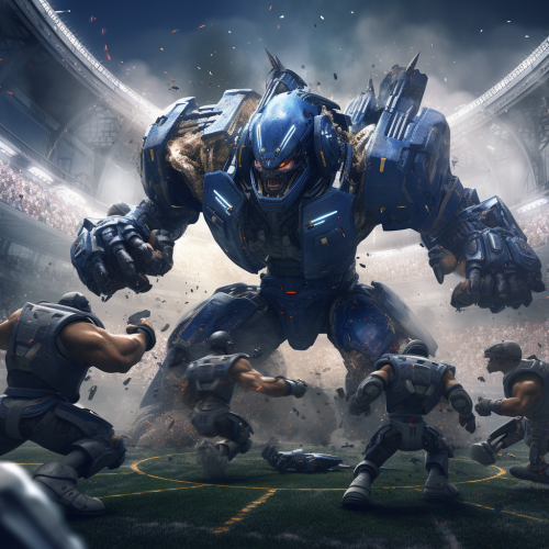 many Giants swole robots playing us football with Navy blues apparel and us football helmet, Pacific rim inspired, avalanche background, Epic, photorealistic