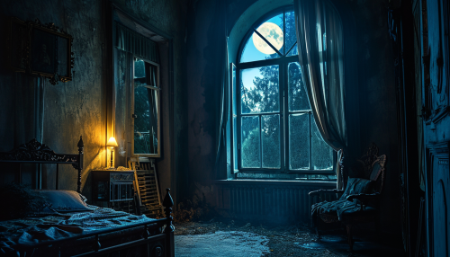 A wonderful night photo. Moonlight breaks through the window, illuminating the space around. Dark and deep colors. Gothic romanticism --ar 7:4 --v 6.0