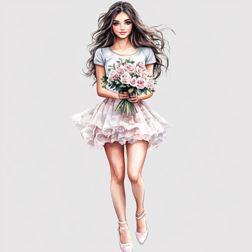 high detailed watercolor clipart full body of a beautiful girl with dark beautiful long thick hair, curls falling to the side, beautiful soft makeup, standing, holding a bouquet of pastel pink roses in her hands, wearing a beautiful white tight short sleeve t-shirt and ballet layered pastel pink skirt and heeled shoes, smile, soft colors, beautiful illustration with realistic details, high resolution, gray background