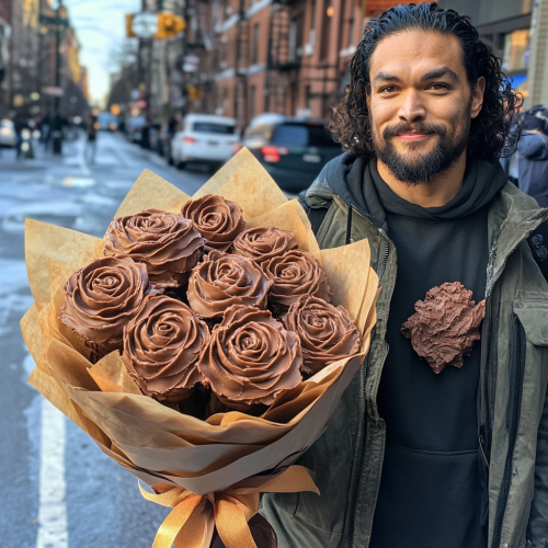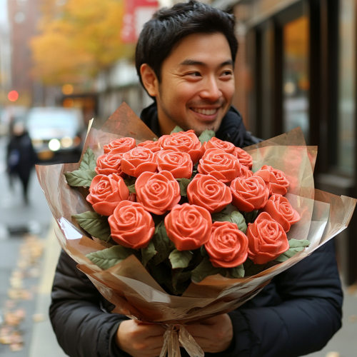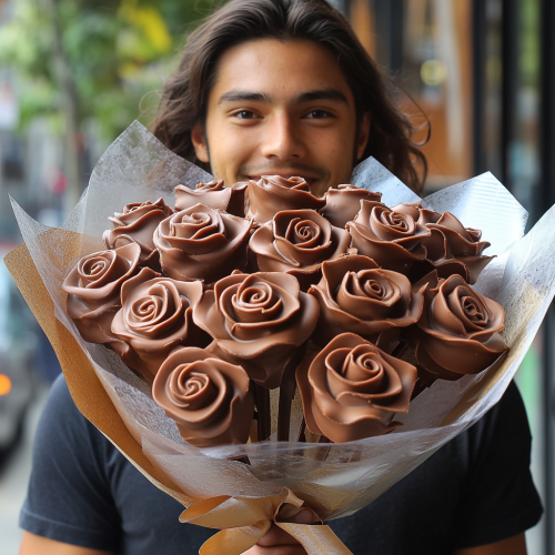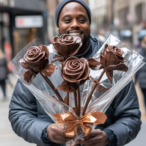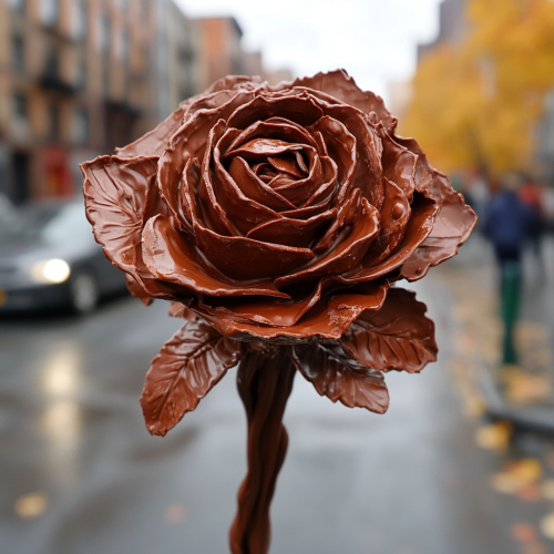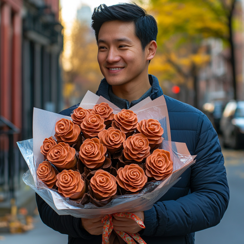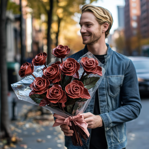 Create a beautiful hyper realistic rose made out of milk chocolate. Then create a bouquet of these roses. A handsome man is going to give this bouquet to his girlfriend. He has a smile on his face as he is walking down the street on a cool autumn afternoon in the Bronx. --v 6.1