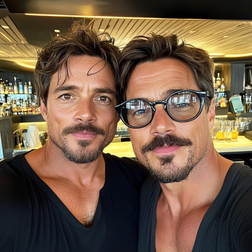 brad pitt with brown eyes taking a selfie with another handsome man who has a moustache and black thick rim glasses. Behind them is an airport bar in a lounge setting