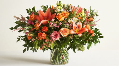 A stunning birthday bouquet filled with a vibrant mix of flowers, including roses, lilies, and wildflowers, arranged in a natural and elegant style. The flowers are in soft yet vivid colors, with delicate greens and rich petals creating a lively yet harmonious contrast. The background is subtly blurred in soft, light tones to keep focus on the bouquet, adding a gentle, celebratory feel. Photorealistic details capture the textures and freshness of each flower, evoking warmth and joy. --ar 16:9