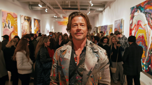 Brad Pitt standing in front of a large crowd; a gallery with his paintings on display; vibrant and emotive; abstract expressionism --ar 16:9 --v 6.0