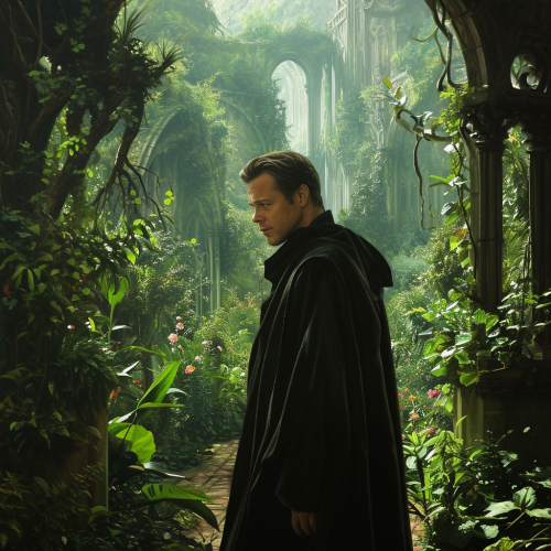 the Garden of Eden lush and beautiful visited by Brad Pitt in an ominious black cloak --v 6.0