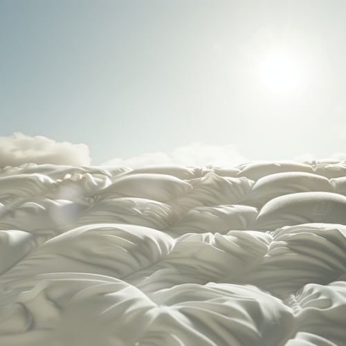 Create a detailed image of a white, uncovered mattress captured from a low angle, looking upward. The scene should emphasize the brightness and purity of the mattress, with the sun shining prominently in one corner of the image. The lighting should be natural, with the sunlight casting soft shadows and highlights across the surface of the mattress. The perspective should be from below the mattress, focusing on the underside as the camera looks upward towards the sky, creating a dramatic and airy effect, 17:9 --v 6.0 --style raw