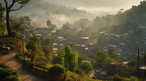 Abbottabad, Pakistan, nestled within the lush greenery of the Himalayan foothills, picturesque houses with sloping rooftops dotting the landscape, surrounded by towering pine trees and winding roads, mist creeping over the hills at dawn, the calmness of the town blending with the chirping of birds, the view of distant snow-capped mountains in the backdrop, evoking a sense of peace and serenity, Photographed by Sebastiao Salgado, using a Nikon D850 with a 24-70mm lens, natural soft lighting with ambient light filtering through mist, 8K, Ultra-HD, Super-Resolution --v 5.0 --ar 16:9 --s 750