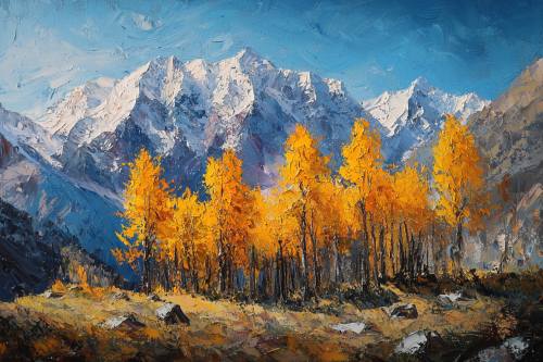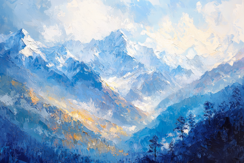 Large brush strokes with a scraper, oil painting with a scraper, oil painting of the Himalayan mountains, Blue Trees, the sun shining on the upper left, Ultra HD --ar 3:2 --quality 2