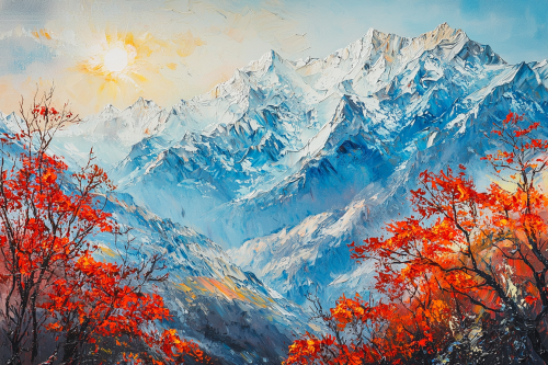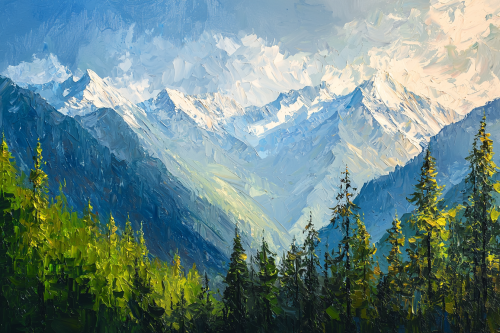 Large brush strokes with a scraper, oil painting with a scraper, oil painting of the Himalayan mountains, Green Trees, the sun shining on the top left, Ultra HD --ar 3:2 --quality 2