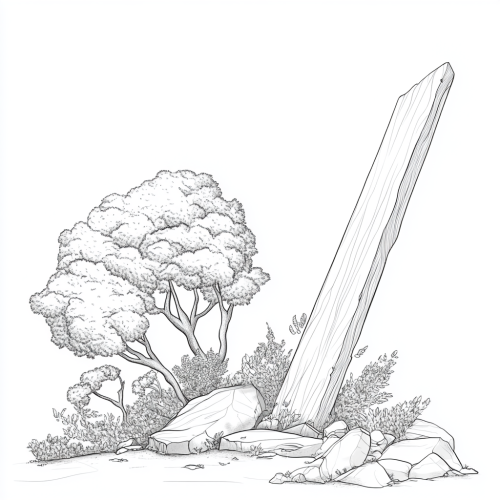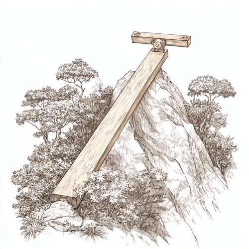 Digital illustration in the style of a line drawing, featuring a large wooden lever placed on top of a pointy triangular mountain. The mountain serves as the fulcrum and is covered in various types of trees, including Australian natives like wattle and magnolia trees. The wooden lever stretches across the entire width of the image, creating a striking contrast between the organic shapes of the mountain and trees and the straight lines of the lever. The scene is minimalistic yet detailed, with a focus on texture and natural elements.