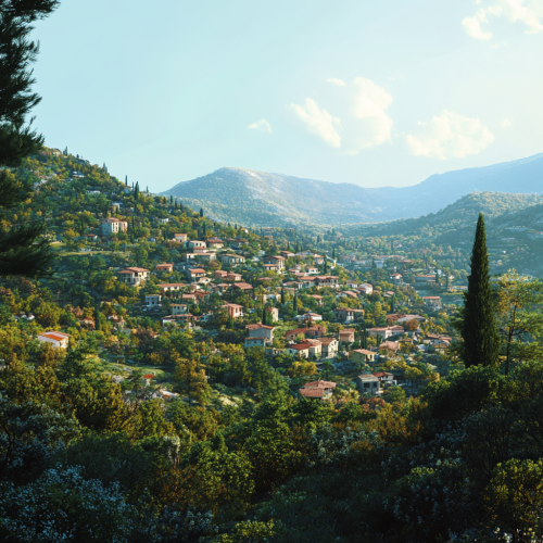 Southern European mountain side of a city with forest and many houses, picture from long distance, mix between Italian and Greek landscape, daytime, hot weather, blue sky, realistic image