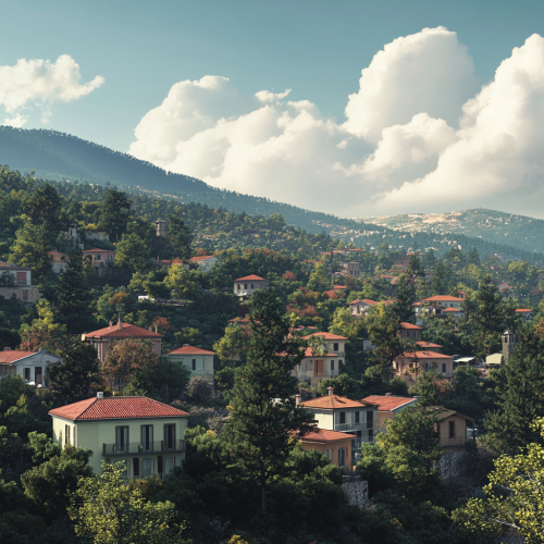 Southern European mountain side of a city with forest and many houses, picture from distance, mix between Italian and Greek landscape, daytime, hot weather, blue sky, realistic image