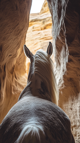 rock caverns like antelope canyon, pov from behind dark gray dapple horse ears with white mane, sunlight, high contrast, 8k detail, shot on a Sony Alpha a7 III camera --ar 9:16