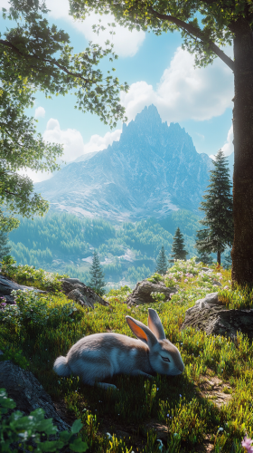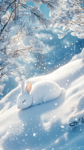 Among the snow-covered trees near the top of a high mountain, a white rabbit is curled up and sleeping. The surroundings are blanketed in deep snow, covering the branches and ground. The sky above is a clear winter blue, with the cold air feeling crisp and transparent. Sunlight reflects off the snow, casting a warm glow on the rabbit's white fur. As the breeze stirs, the trees sway realistically, and snowflakes gently shimmer as they fall. This scene is depicted as an anime illustration in Makoto Shinkai’s style, with intricate details, even more vibrant and bright colors, and a sense of wonder. The scene is dreamlike yet captures the real beauty of winter nature. --ar 9:16 --v 6.1