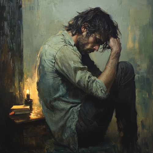Picture a sad man trying to touch his own shoulder. Have the man look back at the viewer over his right shoulder. Have long hair and miserable clothing. Make this picture so that we can see the man from the right side, with his back slightly turned towards us. man with his left hand over his right shoulder to his right shoulder blade. Let him try to touch it. Let the left side of the man's face be in shadow and the light shine over his right shoulder. Make the picture in oil painting style. Let the man be anatomically proportionate. Let the man's entire body be visible, down to his kneecaps. Let there be pastel shades of green, blue and yellow in the picture. Let the background be dark. Let there be a burning lamp and an open book on the floor on the left.