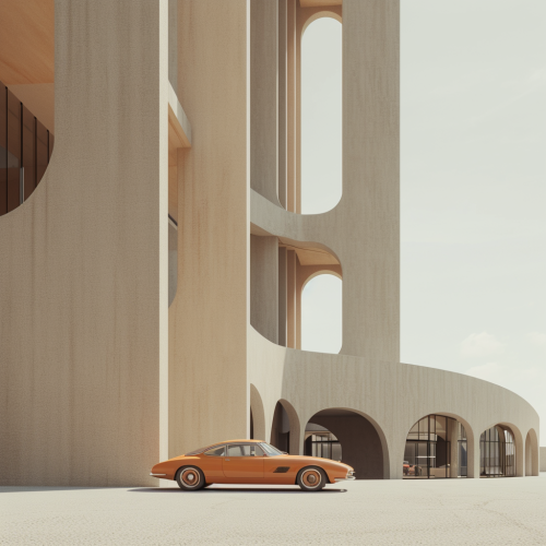 cinematic, a car driving in a city, in the style of brutalist architecture, vray, atmospheric serenity, light beige and orange, matte painting, sense of quiet contemplation, monolithic structures, clean lines --v 6.0