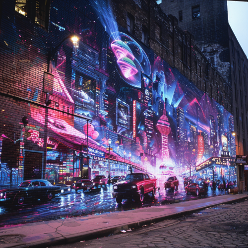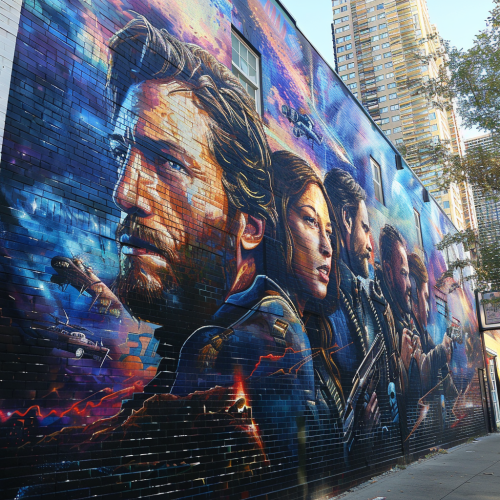 a mural on an long inner city brick wall depicting scenes from the movie serenity, realistic --s 250