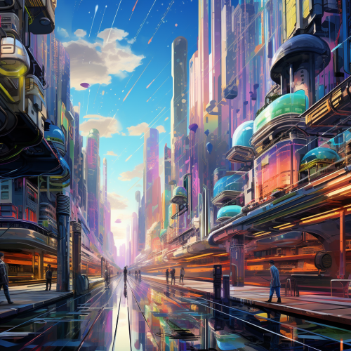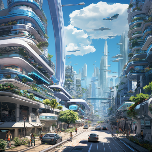 futuristic city in 2223, futuristic street during day, blue sky, futurology, psychadelic, flying cars,